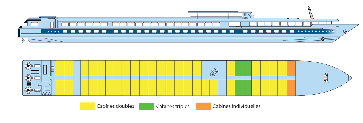 Ce charmant bateau 4 ancres à taille humaine, avec seulement 78 cabines, est constitué de 2 ponts et aménagé de façon à disposer d'un maximum d'espace et de lumière en misant sur des couleurs et du mobilier très chaleureux, vous aimerez aussi profiter de votre cabine spacieuse et bien équipée où de votre fenêtre vous découvrirez des paysages différents chaque jour.
